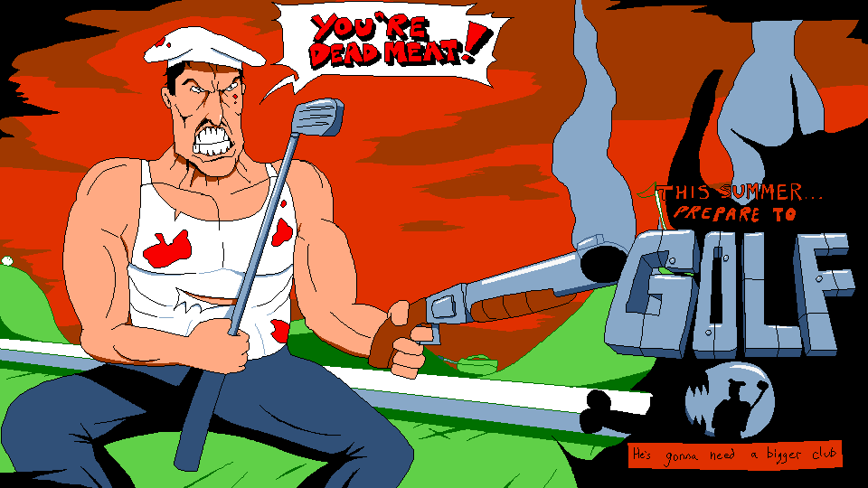 - The titlecard is obviously based on DOOM and Duke Nukem the design, and with Peppino carrying a shotgun, and it obviously being taken place in a hellish landscape. The title of the level, "GOLF", is also stylized in all caps, similarly to DOOM's logo.